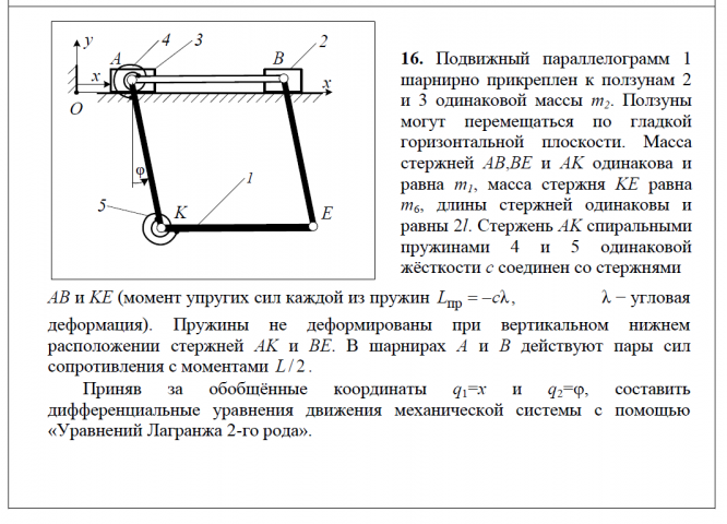 16. Подвижный параллелограмм 1 шарнирно прикреплен к ползунам 2 и 3 одинаковой массы m2. Ползуны могут перемещаться по гладкой горизонтальной плоскости. Масса стержней AB,BE и AK одинакова и равна m1, масса стержня KE равна m6, длины стержней одинаковы и равны 2l. Стержень AK спиральными пружинами 4 и 5 одинаковой жёсткости c соединен со стержнями AB и KE (момент упругих сил каждой из пружин L cλ пр , λ − угловая деформация). Пружины не деформированы при вертикальном нижнем расположении стержней AK и BE. В шарнирах A и B действуют пары сил сопротивления с моментами L/ 2 . Приняв за обобщённые координаты q1=x и q2=, составить дифференциальные уравнения движения механической системы с помощью «Уравнений Лагранжа 2-го рода». .