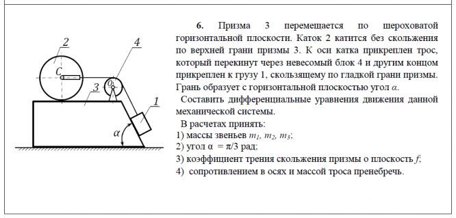 6. Призма 3 перемещается по шероховатой горизонтальной плоскости. Каток 2 катится без скольжения по верхней грани призмы 3. К оси катка прикреплен трос, который перекинут через невесомый блок 4 и другим концом прикреплен к грузу 1, скользящему по гладкой грани призмы. Грань образует с горизонтальной плоскостью угол α. Составить дифференциальные уравнения движения данной механической системы. В расчетах принять: 1) массы звеньев m1, m2, m3; 2) угол α = π/3 рад; 3) коэффициент трения скольжения призмы о плоскость f; 4) сопротивлением в осях и массой троса пренебречь..