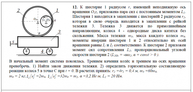 12. К шестерне 1 радиусом r, имеющей неподвижную ось вращения O1z, приложена пара сил с постоянным моментом L1. Шестерня 1 находится в зацеплении c шестернёй 2 радиусом r2, которая в свою очередь находится в зацеплении с рейкой тележки 3. Тележка 3 движется по прямолинейным направляющим, колеса 4 - однородные диска катятся без скольжения. Масса тележки m3, масса каждого колеса m4, моменты инерции шестерен 1 и 2 относительно их осей вращения равны I1 и I2 соответственно. К шестерне 2 приложен момент сил сопротивления L2, пропорциональный угловой скорости шестерни 2 (L2Oz = -αω2, α = const > 0 ). 2 1 s C O2z O1z 3 4 L1 A B В начальный момент система покоилась.