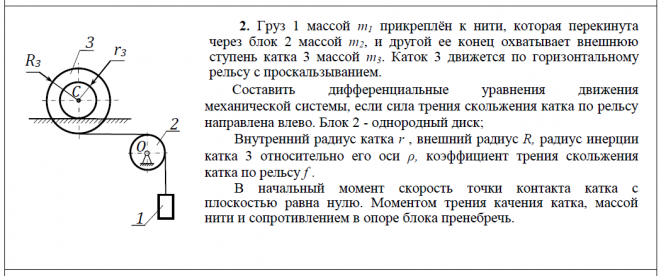 2. Груз 1 массой m1 прикреплён к нити, которая перекинута через блок 2 массой m2, и другой ее конец охватывает внешнюю ступень катка 3 массой m3. Каток 3 движется по горизонтальному рельсу с проскальзыванием. Составить дифференциальные уравнения движения механической системы, если сила трения скольжения катка по рельсу направлена влево. Блок 2 - однородный диск; Внутренний радиус катка r , внешний радиус R, радиус инерции катка 3 относительно его оси ρ, коэффициент трения скольжения катка по рельсу f . В начальный момент скорость точки контакта катка с плоскостью равна нулю. Моментом трения качения катка, массой нити и сопротивлением в опоре блока пренебречь. .