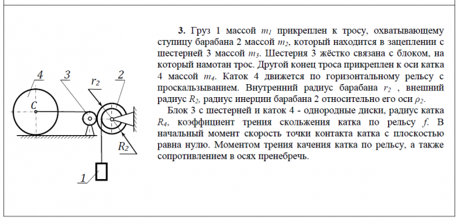 2. Груз 1 массой m1 прикреплён к нити, которая перекинута через блок 2 массой m2, и другой ее конец охватывает внешнюю ступень катка 3 массой m3. Каток 3 движется по горизонтальному рельсу с проскальзыванием. Составить дифференциальные уравнения движения механической системы, если сила трения скольжения катка по рельсу направлена влево. Блок 2 - однородный диск; Внутренний радиус катка r , внешний радиус R, радиус инерции катка 3 относительно его оси ρ, коэффициент трения скольжения катка по рельсу f . В начальный момент скорость точки контакта катка с плоскостью равна нулю. Моментом трения качения катка, массой нити и сопротивлением в опоре блока пренебречь. .