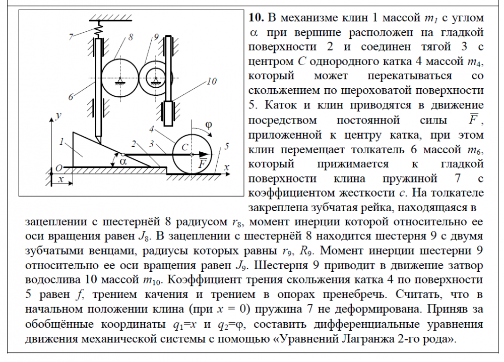 зацеплении с шестернёй 8 радиусом r8, момент инерции которой относительно ее оси вращения равен J8. В зацеплении с шестернёй 8 находится шестерня 9 с двумя зубчатыми венцами, радиусы которых равны r9, R9. Момент инерции шестерни 9 относительно ее оси вращения равен J9. Шестерня 9 приводит в движение затвор водослива 10 массой m10. Коэффициент трения скольжения катка 4 по поверхности 5 равен f, трением качения и трением в опорах пренебречь. Считать, что в начальном положении клина (при x = 0) пружина 7 не деформирована. Приняв за обобщённые координаты q1=x и q2=, составить дифференциальные уравнения движения механической системы с помощью «Уравнений Лагранжа 2-го рода»..