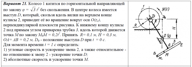 Вариант 21. Колесо 1 катится по горизонтальной направляющей по закону φ = 3 t 2 без скольжения. В центре колеса имеется выступ D, который, скользя вдоль вилки на верхнем конце кулисы 2, приводит её во вращение вокруг оси O(z1), перпендикулярной плоскости рисунка. К нижнему концу кулисы 2 под прямым углом приварена трубка 3, вдоль которой движется точка М по закону M0M = 0,2t 2 . Принять R= 0,1 м, H = 0,3 м, ОА= АВ = 0,2 м, D0 - положение выступа D при t = 0 с. Для момента времени t = 1 c определить: 1) угловые скорость и ускорение звена 2, а также относительное - по отношению к звену 2 - ускорение точки D; 2) абсолютные скорость и ускорение точки M..