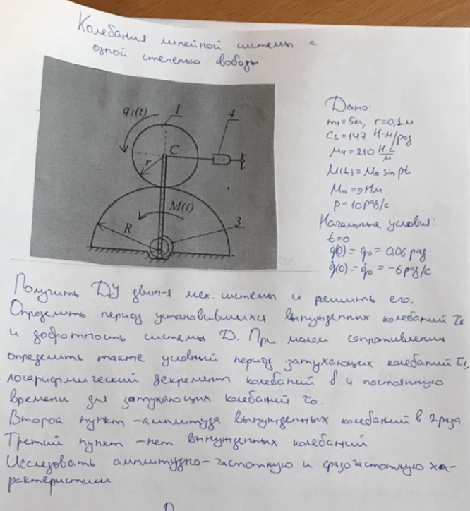 Внешнее воздействие во всех вариантах изменяется во времени по закону sinpt. При выполнении домашнего задания "Малые колебания - определение параметров колебательного процесса" необходимо: 1. Составить дифференциальное уравнение малых колебаний системы. 2. Получить решение этого уравнения и, используя заданные начальные условия, определить постоянные интегрирования. 3. Определить период установившихся вынужденных колебаний Tв и добротность системы Д, а для вариантов с малым линейно-вязким сопротивлением (n < k ) дополнительно: Т1 - условный период затухающих колебаний, δ - логарифмический декремент колебаний, τ0- постоянную времени затухающих колебаний. При выполнении домашнего задания "Малые колебания - исследование колебательного процесса" предполагается, что по истечении времени 4Tв + 3/n (4Tв + 3 τ0) амплитуда внешнего воздействия увеличивается в два раза, а еще через такой же промежуток времени внешнее воздействие прекращается.