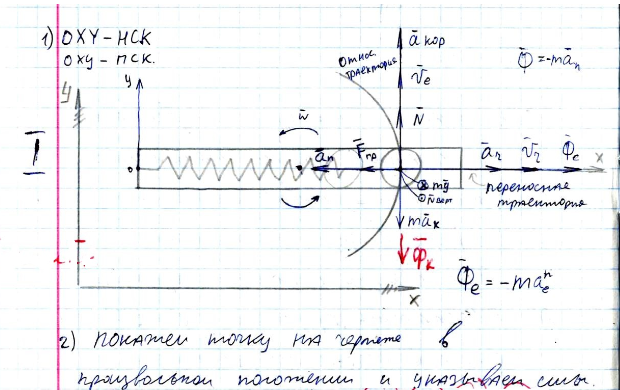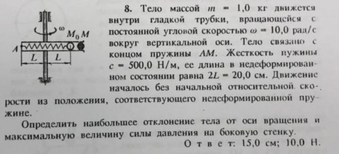 - Тело массой m=1,0 кг движется внутри гладкой трубки, вращающейся с постоянной угловой скоростью w=10,0 рад/с вокруг вертикальной оси. Тело связано с концом пружины AM. Жесткость пружины с=500 Н/м, ее длина в недеформированном состоянии равна 2L=20,0 см. Движение началось без начальной относительной скорости из положения, соответствующего недеформированной пружине. Определить наибольшее отклонение тела от оси вращения и максимальную величину силы давления на боковую стенку. Ответ 15,0 см. 10,0 Н.
