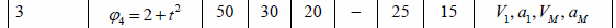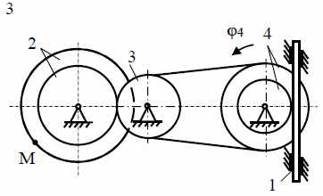 Механизм состоит из рейки 1, колес 2, 3, 4, находящихся в зацеплении или связанных ременной передачей (рис. 10 а, б, в). Исходные данные приведены в табл. 5. По заданному уравнению движения ведущего звена механизма определить в момент времени t1 = 1 c величины, указанные в последнем столбце табл. 5. Считать, что скольжение в ременной передаче, в точке контакта колес, в точке контакта колеса и рейки отсутствует.