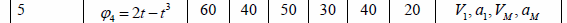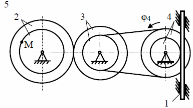 Механизм состоит из рейки 1, колес 2, 3, 4, находящихся в зацеплении или связанных ременной передачей (рис. 10 а, б, в). Исходные данные приведены в табл. 5. По заданному уравнению движения ведущего звена механизма определить в момент времени t1 = 1 c величины, указанные в последнем столбце табл. 5. Считать, что скольжение в ременной передаче, в точке контакта колес, в точке контакта колеса и рейки отсутствует.