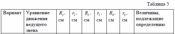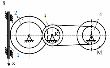 Механизм состоит из рейки 1, колес 2, 3, 4, находящихся в зацеплении или связанных ременной передачей (рис. 10 а, б, в). Исходные данные приведены в табл. 5. По заданному уравнению движения ведущего звена механизма определить в момент времени t1 = 1 c величины, указанные в последнем столбце табл. 5. Считать, что скольжение в ременной передаче, в точке контакта колес, в точке контакта колеса и рейки отсутствует.