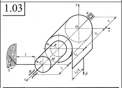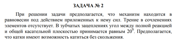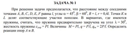 Условия: Пример оформления ЗАДАЧА №1 При решении задачи предполагается, что расстояние между соседними точками А, В, С, О, Е, Е равны /, углы а = 45°, В = 60’, ®=1,г= 0,41. Точки Ки 1 делят соответствующие участки пополам. В вариантах, где имеются пружины, считать, что пружина предварительно закручена на угол = 30°, жесткость пружины с,» = Р/. Величины М= 2,4 = РИ, 4» = 2Р/. Определить реакции опор А и В. ЗАДАЧА №2 При решении задачи предполагается, что механизм находится в равновесии под действием приложенных к нему сил. Трение в сочленениях элементов отсутствует. В зубчатых зацеплениях угол между полной реакцией и общей касательной плоскостью принимается равным 20°.