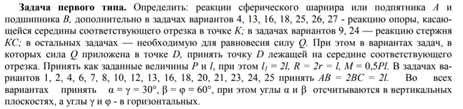 Задача первого типа. Определить: реакции сферического шарнира или подпятника А и