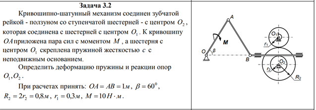Предполагается, что катки имеют возможность катиться без скольжения. Задача 3.2 Кривошипно-шатунный механизм соединен зубчатой рейкой - ползуном со ступенчатой шестерней - с центром О, которая соединена с шестерней с центром О, . К кривошипу `Олприложена пара сил с моментом М ‚ а шестерня с центром О, скреплена пружиной жесткостью с с неподвижным основанием. Определить деформацию пружины и реакции опор 0,.0,. При расчетах принять: ОА = АВ = 1м, д = 60°, К, =21, =08м, п =03м, М =ЮН-м. Задача первого типа. Определить: реакции сферического шарнира или подпятника А и юдшипника В, дополнительно в задачах вариантов 4, 13, 16, 18, 25, 26, 27 - реакцию опоры, касаю- цейся середины соответствующего отрезка в точке К; в задачах вариантов 9, 24 — реакцию стержня КС; в остальных задачах — необходимую для равновесия силу О.