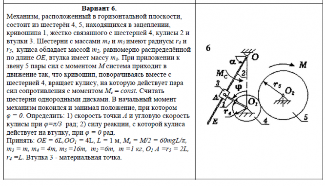 Вариант 6. Механизм, расположенный в горизонтальной плоскости, состоит из шестерён 4, 5, находящихся в зацеплении, кривошипа 1, жёстко связанного с шестерней 4, кулисы 2 и втулки 3. Шестерни с массами т4 и т5 имеют радиусы r4 и r5, кулиса обладает массой т2, равномерно распределённой по длине ОЕ, втулка имеет массу т3. При приложении к звену 5 пары сил с моментом М система приходит в движение так, что кривошип, поворачиваясь вместе с шестерней 4, вращает кулису, на которую действует пара сил сопротивления с моментом Мс = сопst. Считать шестерни однородными дисками. В начальный момент механизм покоился и занимал положение, при котором φ = 0. Определить: 1) скорость точки А и угловую скорость кулисы при φ=π/3 рад; 2) силу реакции, с которой кулиса действует на втулку, при φ = 0 рад.