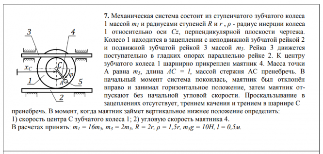 7. Механическая система состоит из ступенчатого зубчатого колеса 1 массой m1 и радиусами ступеней R и r , ρ - радиус инерции колеса 1 относительно оси Сz, перпендикулярной плоскости чертежа. Колесо 1 находится в зацеплении с неподвижной зубчатой рейкой 2 и подвижной зубчатой рейкой 3 массой m3. Рейка 3 движется поступательно в гладких опорах параллельно рейке 2. К центру зубчатого колеса 1 шарнирно прикреплен маятник 4. Масса точки A равна m5, длина AC = l, массой стержня AC пренебречь. В начальный момент система покоилась, маятник был отклонён вправо и занимал горизонтальное положение, затем маятник отпускают без начальной угловой скорости. Проскальзывание в зацеплениях отсутствует, трением качения и трением в шарнире C пренебречь.