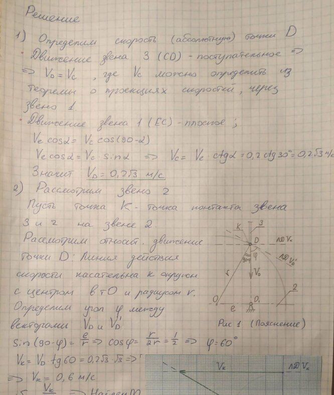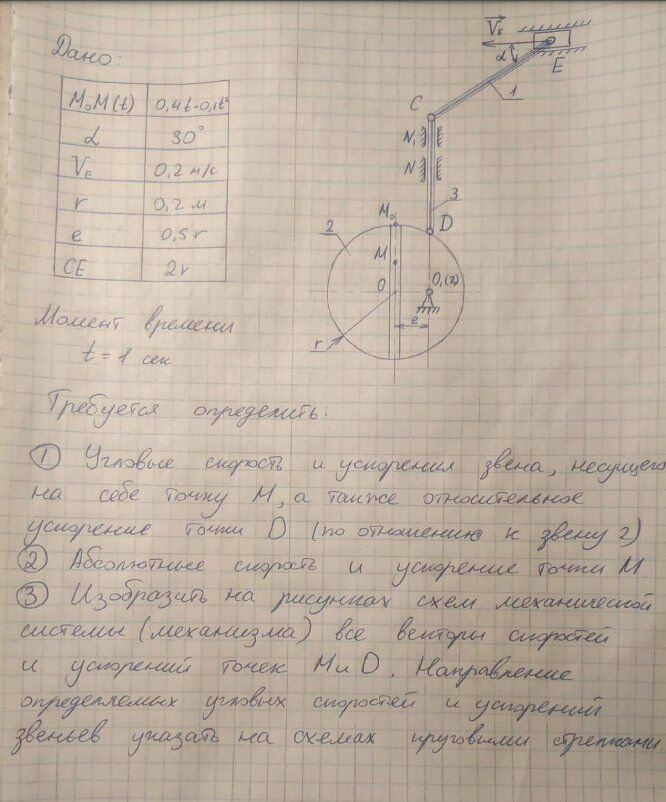 Вариант 10. Ползун E, двигаясь в горизонтальных направляющих с постоянной скоростью VE , приводит в движение шарнирно связанные между собой стержни 1 и 3. Стержень - толкатель 3, двигаясь в направляющих N и N1, приводит во вращательное движение вокруг оси O1(z1), перпендикулярной плоскости рисунка, кулачок 2. Кулачок 2 представляет собой диск с эксцентриситетом е. В прямолинейном пазе кулачка 2 движется точка М по закону M0M = 0,4t -0,1t 2 . Принять α = 30°, VE =0,2 м/с, r = 0,2 м, е=0,5r, СЕ=2r. Для момента времени t = 1 c определить: 1) угловые скорость и ускорение звена, несущего на себе точку М, а также относительное ускорение точки D (по отношению к звену 2); 2) абсолютные скорость и ускорение точки M.