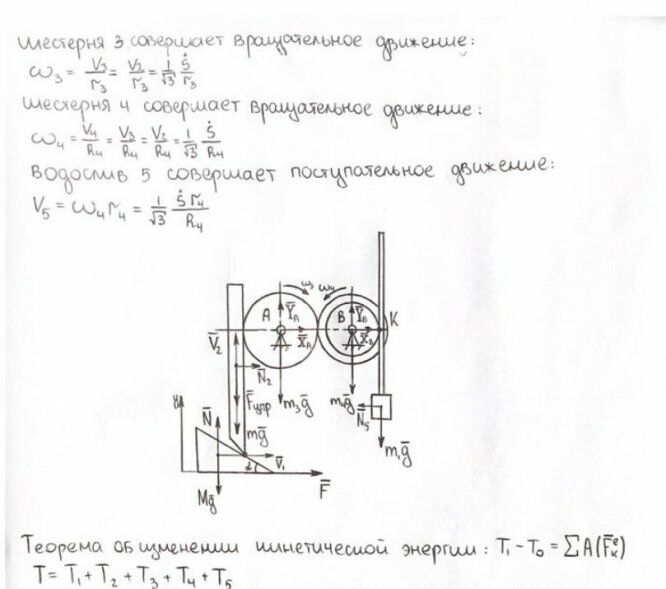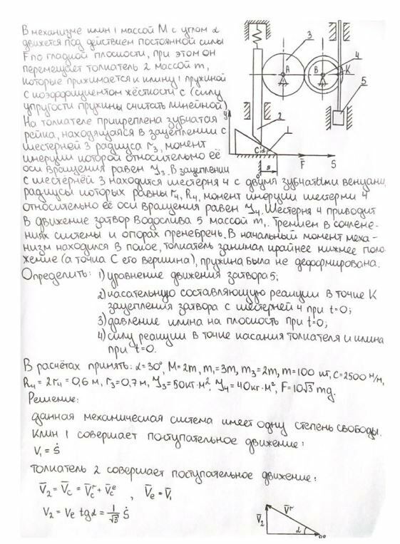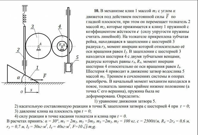 10. В механизме клин 1 массой m1 с углом α движется под действием постоянной силы F по гладкой плоскости, при этом он перемещает толкатель 2 массой m2, которые прижимается к клину 1 пружиной с коэффициентом жёсткости c (силу упругости пружины считать линейной). На толкателе прикреплена зубчатая рейка, находящаяся в зацеплении с шестернёй 3 радиуса r3, момент инерции которой относительно её оси вращения равен I3. В зацеплении с шестерней 3 находится шестерня 4 с двумя зубчатыми венцами, радиусы которых равны r4, R4, момент инерции шестерни 4 относительно ее оси вращения равен I4. Шестерня 4 приводит в движение затвор водослива 5 массой m5. Трением в сочленениях системы и опорах пренебречь. В начальный момент механизм находился в покое, толкатель занимал крайнее нижнее положение (а точка C его вершина), пружина была не деформирована. Определить: 1) уравнение движения затвора 5. 2) касательную составляющую реакции в точке K зацепления затвора с шестерней 4 при t = 0; 3) давление клина на плоскость при t = 0; 4) силу реакции в точке касания толкателя и клина при t = 0.