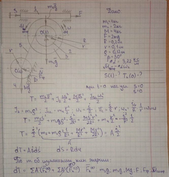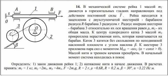 14. В механической системе рейка 1 массой m1 движется в горизонтальных гладких направляющих под действием постоянной силы F . Рейка находится в зацеплении с двухступенчатой шестернёй - барабаном радиуса R барабана 3 радиусом r. Радиус инерции шестерни - барабана 3 относительно их оси вращения равен ρ, m2 - их общая масса. К центру однородного катка 3 массой m3 прикреплена нерастяжимая нить, которая наматывается на барабан. Каток 3 катится без скольжения по неподвижной наклонной плоскости с углом наклона β. К шестерне 3 приложена пара сил с моментом MOZ = -αω2 (α = const > 0). Массой нити и трением качения пренебречь. В начальный момент система находилась в покое. Определить: 1) закон движения рейки 1; 2) натяжение нити в начале движения. В расчетах принять: m1 = 1 кг, m2 =2m1, m3 =4m1, F =2m1g, R = 2 r, ρ =0,6R, R = 0,2 м, β = 30°, α =3,22 Нс·м.