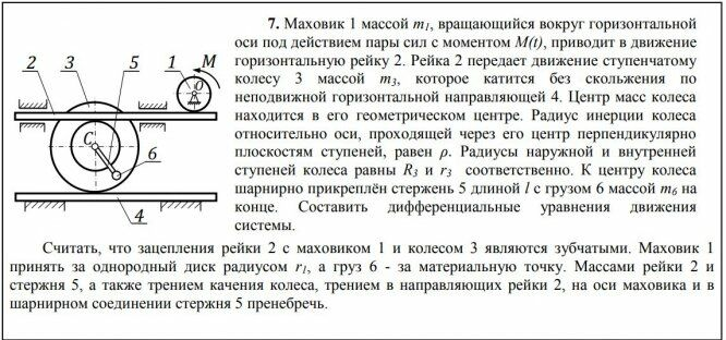 7. Маховик 1 массой m1, вращающийся вокруг горизонтальной оси под действием пары сил с моментом M(t), приводит в движение горизонтальную рейку 2. Рейка 2 передает движение ступенчатому колесу 3 массой m3, которое катится без скольжения по неподвижной горизонтальной направляющей 4. Центр масс колеса находится в его геометрическом центре. Радиус инерции колеса относительно оси, проходящей через его центр перпендикулярно плоскостям ступеней, равен ρ. Радиусы наружной и внутренней ступеней колеса равны R3 и r3 соответственно. К центру колеса шарнирно прикреплён стержень 5 длиной l с грузом 6 массой m6 на конце. Составить дифференциальные уравнения движения системы