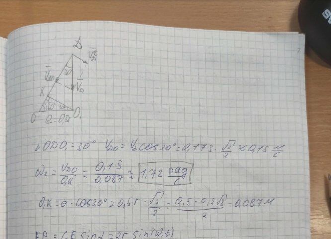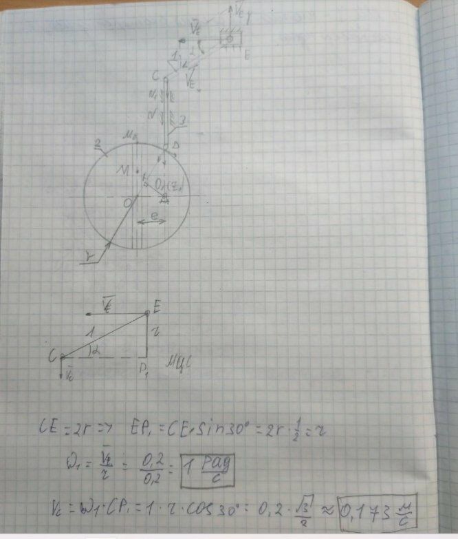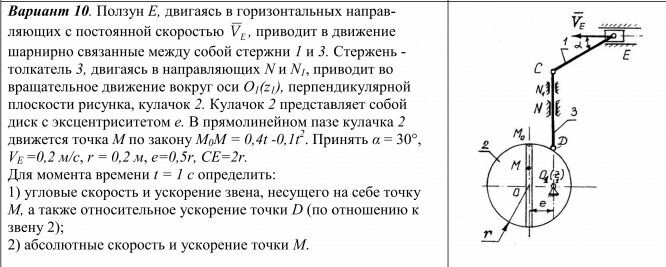 Вариант 10. Ползун E, двигаясь в горизонтальных направляющих с постоянной скоростью VE , приводит в движение шарнирно связанные между собой стержни 1 и 3. Стержень - толкатель 3, двигаясь в направляющих N и N1, приводит во вращательное движение вокруг оси O1(z1), перпендикулярной плоскости рисунка, кулачок 2. Кулачок 2 представляет собой диск с эксцентриситетом е. В прямолинейном пазе кулачка 2 движется точка М по закону M0M = 0,4t -0,1t 2 . Принять α = 30°, VE =0,2 м/с, r = 0,2 м, е=0,5r, СЕ=2r. Для момента времени t = 1 c определить: 1) угловые скорость и ускорение звена, несущего на себе точку М, а также относительное ускорение точки D (по отношению к звену 2); 2) абсолютные скорость и ускорение точки M.