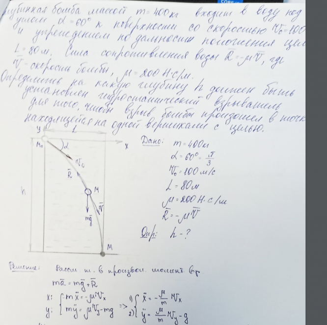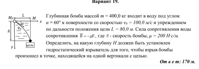 Глубинная бомба массой т = 400,0 кг входит в воду под углом α = 60° к поверхности со скоростью v0 = 100,0 м/с и упреждением по дальности положения цели L = 80,0 м. Сила сопротивления воды сопротивления R v , где v - скорость бомбы, μ = 200 Н·с/м. Определить, на какую глубину Н должен быть установлен гидростатический взрыватель для того, чтобы взрыв бомбы произошел в точке, находящейся на одной вертикали с целью.