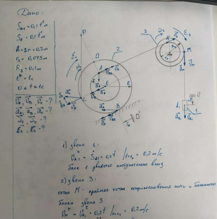 Механическая система состоит из груза 1, ступенчатого катка 2 и ступенчатого блока 3. Груз 1 движется вертикально по закону 2 0,1 1 S t A м на нити, наматывающейся на большую ступень блока 3. Малые ступени блока 3 и катка 2 связаны другой нитью. Каток катится по наклонной плоскости. Закон движения центра катка 2 S 0,1t E м. Принять R 2r 0,2 м, r3 0,075 м, R3 0,1 м, 1 t с, 0 t 1 с.