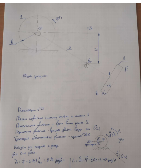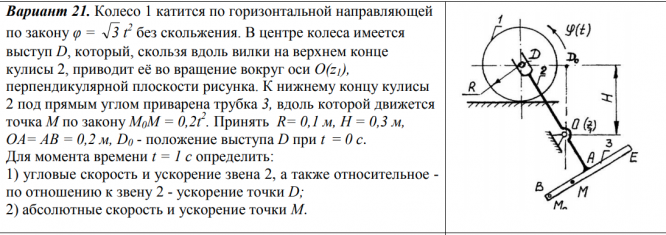 Вариант 21. Колесо 1 катится по горизонтальной направляющей по закону φ = 3 t 2 без скольжения. В центре колеса имеется выступ D, который, скользя вдоль вилки на верхнем конце кулисы 2, приводит её во вращение вокруг оси O(z1), перпендикулярной плоскости рисунка. К нижнему концу кулисы 2 под прямым углом приварена трубка 3, вдоль которой движется точка М по закону M0M = 0,2t 2 . Принять R= 0,1 м, H = 0,3 м, ОА= АВ = 0,2 м, D0 - положение выступа D при t = 0 с. Для момента времени t = 1 c определить: 1) угловые скорость и ускорение звена 2, а также относительное - по отношению к звену 2 - ускорение точки D; 2) абсолютные скорость и ускорение точки M.