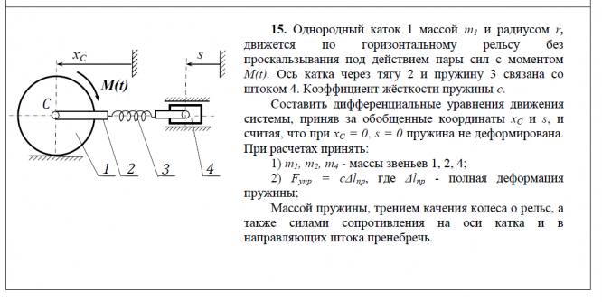 15. Однородный каток 1 массой m1 и радиусом r, движется по горизонтальному рельсу без проскальзывания под действием пары сил с моментом M(t). Ось катка через тягу 2 и пружину 3 связана со штоком 4. Коэффициент жёсткости пружины c. Составить дифференциальные уравнения движения системы, приняв за обобщенные координаты xC и s, и считая, что при xC = 0, s = 0 пружина не деформирована. При расчетах принять: 1) m1, m2, m4 - массы звеньев 1, 2, 4; 2) Fупр = cΔlпр, где Δlпр - полная деформация пружины; Массой пружины, трением качения колеса о рельс, а также силами сопротивления на оси катка и в направляющих штока пренебречь..