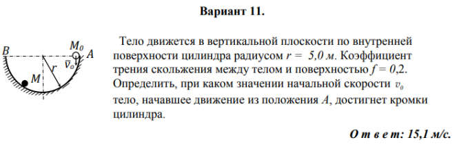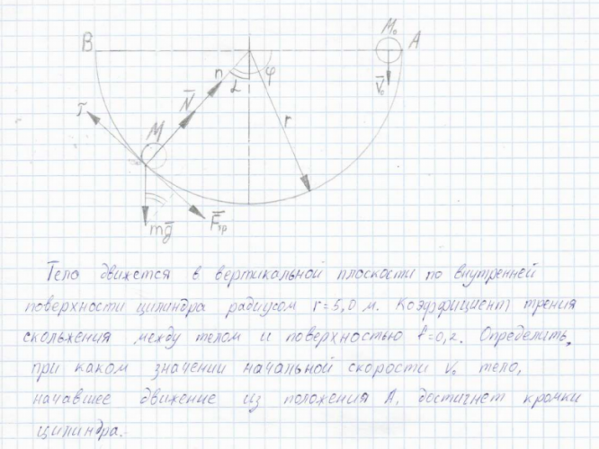 Условие: Тело движется в вертикальной плоскости по внутренней поверхности цилиндра радиусом r = 5,0 м. Коэффициент трения скольжения между телом и поверхностью f = 0,2. Определить, при каком значении начальной скорости V тело, начавшее движение из положения A, достигнет кромки цилиндра.