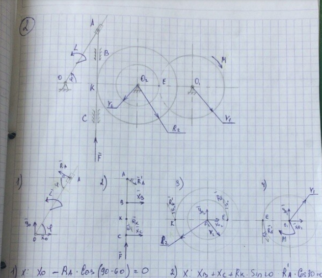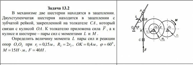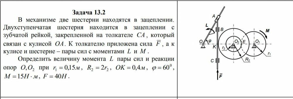 Задача 13.2 В механизме две шестерни находятся в зацеплении. Двухступенчатая шестерня находится в зацеплении с зубчатой рейкой, закрепленной на толкателе CA , который связан с кулисой OA . К толкателю приложена сила F , а к кулисе и шестерне – пары сил с моментами L и M . Определить величину момента L пары сил и реакции опор 2 O,O при r1 0,15м , 2 2 2 R r , OK 0,4м , 0 60 , M 15Н м, F 40Н .