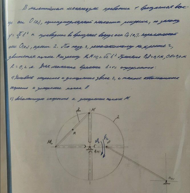Вариант 18. В мальтийском механизме кривошип 1 вращается вокруг оси O(z1), перпендикулярной плоскости рисунка, по закону 2 3 t    и приводит во вращение вокруг оси O (z ) 1 1  , параллельной оси O(z1), крест 2. По пазу 3, расположенному на кресте 2, движется точка М по закону M0M =0,2 2 t 2 . Принять O1D = 0,1 м, OD = 0,4 м, R = 0,2 м. Для момента времени t = 1 c определить: 1) угловые скорость и ускорение звена 2, а также относительное - по отношению к звену 2 - ускорение точки D; 2) абсолютные скорость и ускорение точки M.
