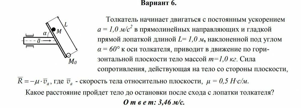 Толкатель начинает двигаться с постоянным ускорением а = 1,0 м/с2 в прямолинейных направляющих и гладкой прямой лопаткой длиной L= 1,0 м, наклоненной под углом α = 60° к оси толкателя, приводит в движение по горизонтальной плоскости тело массой т=1,0 кг. Сила сопротивления, действующая на тело со стороны плоскости R va    , где a v - скорость тела относительно плоскости, μ = 0,5 Н·с/м. Какое расстояние пройдет тело до остановки после схода с лопатки толкателя?