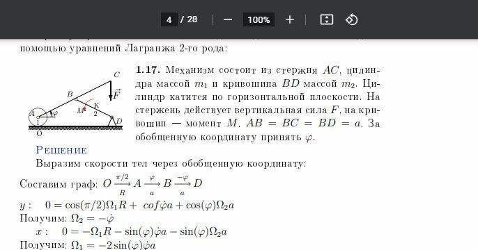 1.39. Стержни OC и OA жестко скреплены под углом 90◦ . В точке C расположена масса m1. Масса цилиндра — m2. К стержню OA приложен момент M. На шарнир A действует сила F. OA = OC = AB = a. За обобщенную координату принять ϕ.
