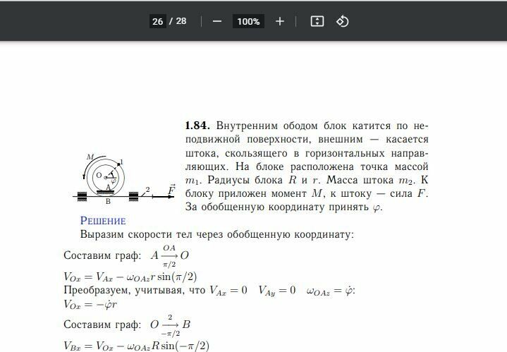 1.84. Внутренним ободом блок катится по неподвижной поверхности, внешним — касается штока, скользящего в горизонтальных направляющих. На блоке расположена точка массой m1. Радиусы блока R и r. Масса штока m2. К блоку приложен момент M, к штоку — сила F. За обобщенную координату принять ϕ.