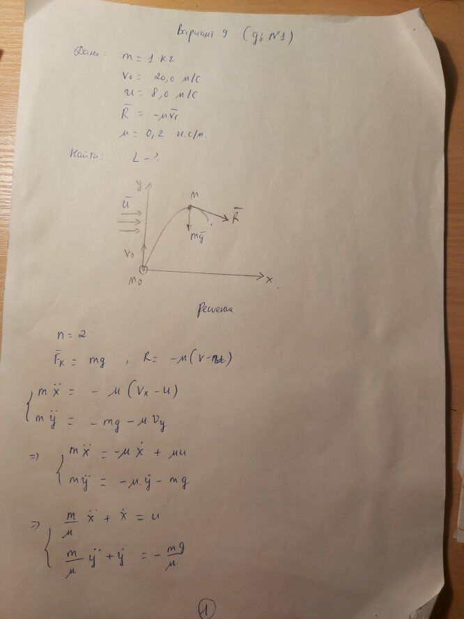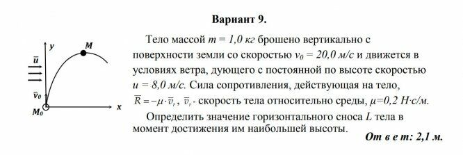 Тело массой т = 1,0 кг брошено вертикально с поверхности земли со скоростью v0 = 20,0 м/с и движется в условиях ветра, дующего с постоянной по высоте скоростью u = 8,0 м/с. Сила сопротивления, действующая на тело, R vr , r v - скорость тела относительно среды, μ=0,2 Н·с/м. Определить значение горизонтального сноса L тела в момент достижения им наибольшей высоты.
