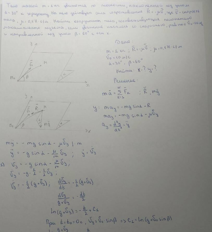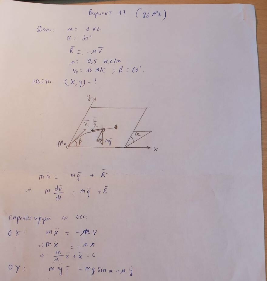 Вариант 17Тело массой т = 1 ,0 кг движется по плоскости, наклонённой под углом α = 30° к горизонту. На тело действует сила сопротивления R v , где v - скорость тела, μ = 0,5 Н·с/м.