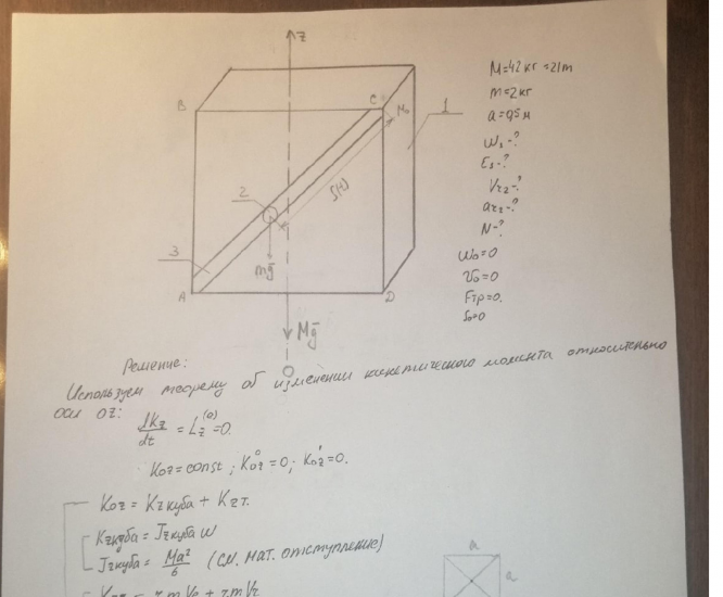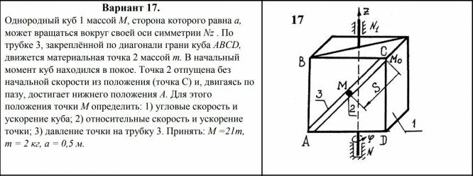 Однородный куб 1 массой М, сторона которого равна а, может вращаться вокруг своей оси симметрии Nz . По трубке 3, закреплённой по диагонали грани куба АВСD, движется материальная точка 2 массой m. В начальный момент куб находился в покое. Точка 2 отпущена без начальной скорости из положения (точка С) и, двигаясь по пазу, достигает нижнего положения А. Для этого положения точки М определить: 1) угловые скорость и ускорение куба; 2) относительные скорость и ускорение точки; 3) давление точки на трубку 3. Принять: M =21m, m = 2 кг, а = 0,5 м