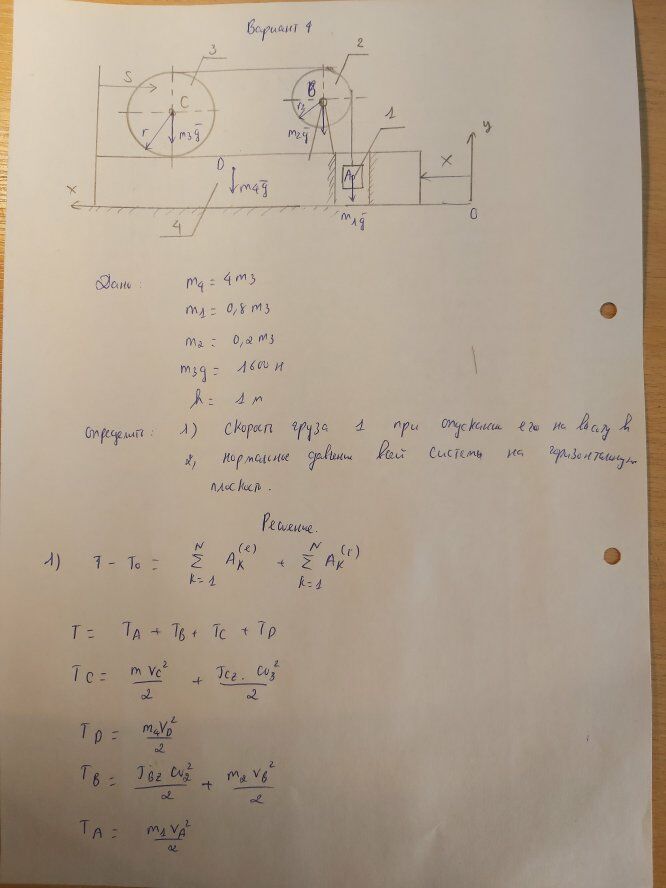 Груз 1 массой m1, опускаясь, посредством нерастяжимой нити, переброшенной через блок 2 массой m2, и намотанной на каток 3 массой m3, приводит его в движение. Каток катится без скольжения по плите 4 массой m4. Плита 4 движется по гладкой плоскости. Каток 3 и блок 2 считать однородными цилиндрами. Колодец в плите, в который опускается груз, гладкий. Трением качения и трением на оси блока 2, массой нити пренебречь. Определить: 1) скорость груза 1при опускании его на высоту h; 2) нормальное давление всей системы на горизонтальную плоскость. В начальный момент система покоилась. В расчетах принять: m4 = 4m3, m1 = 0,8m3, m2 = 0,2m3, m3g = 1600 Н, h = 1м.