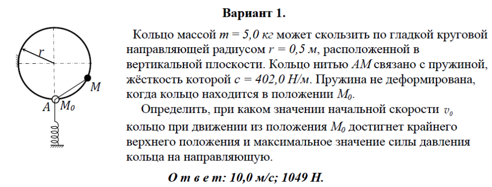 Кольцо массой т = 5,0 кг может скользить по гладкой круговой направляющей радиусом r = 0,5 м, расположенной в вертикальной плоскости. Кольцо нитью АМ связано с пружиной, жёсткость которой с = 402,0 Н/м. Пружина не деформирована, когда кольцо находится в положении М0. Определить, при каком значении начальной скорости 0 v кольцо при движении из положения М0 достигнет крайнего верхнего положения и максимальное значение силы давления кольца на направляющую. О т в е т: 10,0 м/с; 1049 Н..