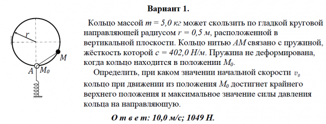 Кольцо массой т = 5,0 кг может скользить по гладкой круговой направляющей радиусом r = 0,5 м, расположенной в вертикальной плоскости. Кольцо нитью АМ связано с пружиной, жёсткость которой с = 402,0 Н/м. Пружина не деформирована, когда кольцо находится в положении М0. Определить, при каком значении начальной скорости 0 v кольцо при движении из положения М0 достигнет крайнего верхнего положения и максимальное значение силы давления кольца на направляющую. О т в е т: 10,0 м/с; 1049 Н..