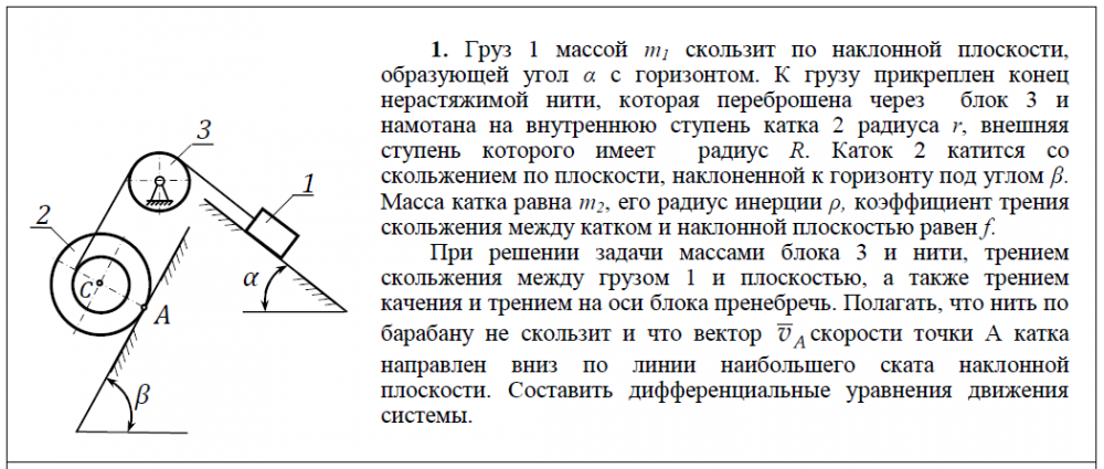 1. Груз 1 массой m1 скользит по наклонной плоскости, образующей угол α с горизонтом. К грузу прикреплен конец нерастяжимой нити, которая переброшена через блок 3 и намотана на внутреннюю ступень катка 2 радиуса r, внешняя ступень которого имеет радиус R. Каток 2 катится со скольжением по плоскости, наклоненной к горизонту под углом β. Масса катка равна m2, его радиус инерции ρ, коэффициент трения скольжения между катком и наклонной плоскостью равен f. При решении задачи массами блока 3 и нити, трением скольжения между грузом 1 и плоскостью, а также трением качения и трением на оси блока пренебречь. Полагать, что нить по барабану не скользит и что вектор vA скорости точки A катка направлен вниз по линии наибольшего ската наклонной плоскости.