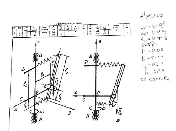 Вариант "б". При угле α = α° (то есть вместо пружин следует поставить жёсткий стержень) определить: 1. Составляющие динамических реакций подпятника А и подшипника B при заданном угле α. 2. Вес грузов PC, PD и PE (материальных точек), которые надо разместить в точках C, D и E крестовины так, чтобы динамические составляющие реакций подшипников были равны нулю, то есть, чтобы система была динамически уравновешена. Расстояния от всех точек C, D и E до оси вращения OZ одинаковы и равны 0,2 м. Расположение точек C, D и E указаны на схемах задач. Для обоих вариантов также известно, что AB= 1,0 м, А0= 0,6 м. Остальные данные для каждого варианта приведены в таблице исходных данных и на схемах задач. При решении задач принять угол α малым (sinα = α, cosα = 1).