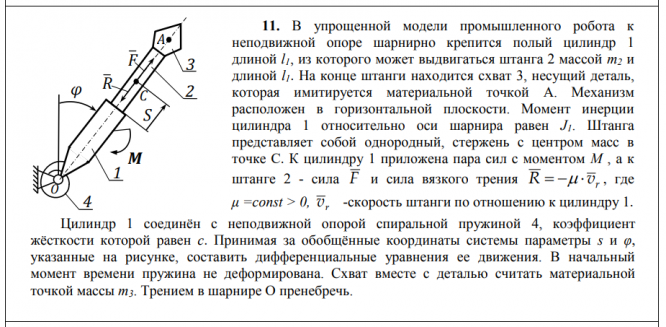 11. В упрощенной модели промышленного робота к неподвижной опоре шарнирно крепится полый цилиндр 1 длиной l1, из которого может выдвигаться штанга 2 массой m2 и длиной l1. На конце штанги находится схват 3, несущий деталь, которая имитируется материальной точкой A. Механизм расположен в горизонтальной плоскости. Момент инерции цилиндра 1 относительно оси шарнира равен J1. Штанга представляет собой однородный, стержень с центром масс в точке C. К цилиндру 1 приложена пара сил с моментом M , а к штанге 2 - сила F и сила вязкого трения R vr    , где μ =const > 0, r v -скорость штанги по отношению к цилиндру 1. Цилиндр 1 соединён с неподвижной опорой спиральной пружиной 4, коэффициент жёсткости которой равен c.