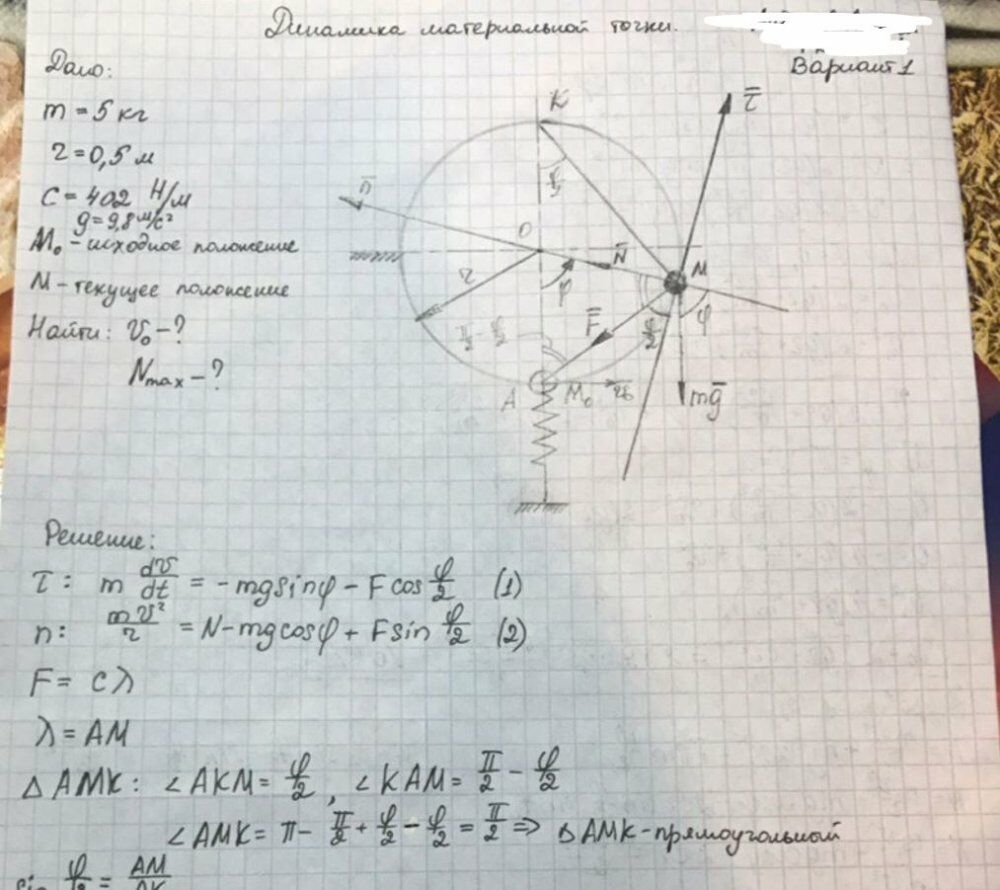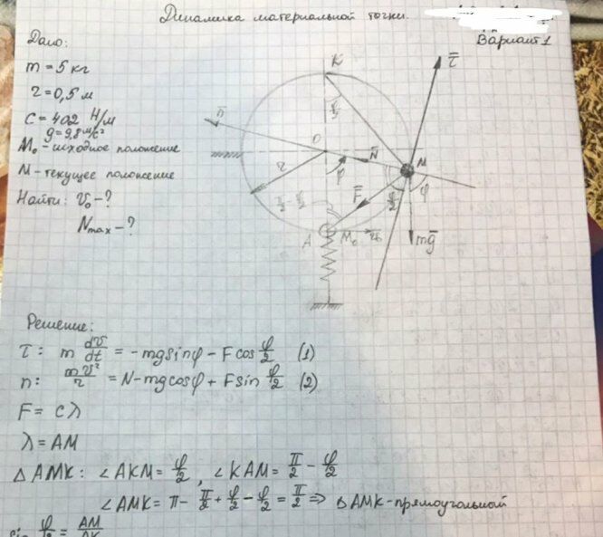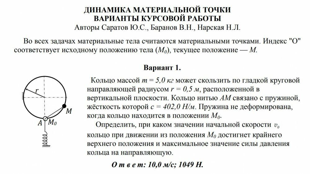 Пример решения:Кольцо массой т = 5,0 кг может скользить по гладкой круговой направляющей радиусом r = 0,5 м, расположенной в вертикальной плоскости. Кольцо нитью АМ связано с пружиной, жёсткость которой с = 402,0 Н/м. Пружина не деформирована, когда кольцо находится в положении М0. Определить, при каком значении начальной скорости 0 v кольцо при движении из положения М0 достигнет крайнего верхнего положения и максимальное значение силы давления кольца на направляющую