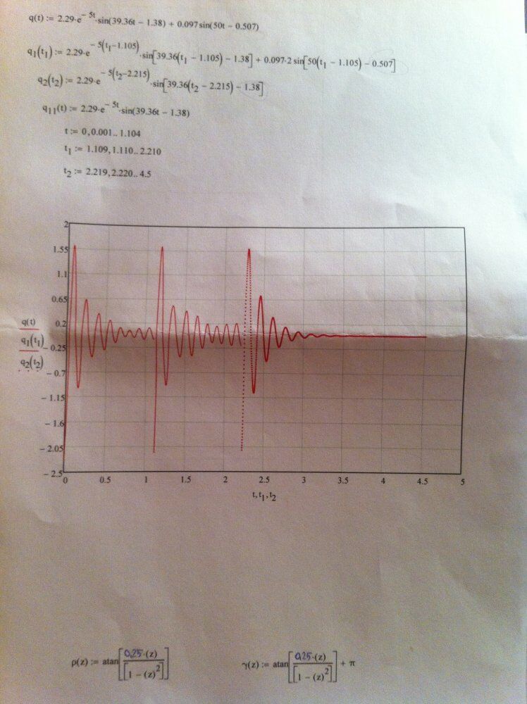 3. Определить период установившихся вынужденных колебаний Tв и добротность системы Д, а для вариантов с малым линейно-вязким сопротивлением (n < k ) дополнительно: Т1 - условный период затухающих колебаний, δ - логарифмический декремент колебаний, τ0- постоянную времени затухающих колебаний. При выполнении домашнего задания "Малые колебания - исследование колебательного процесса" предполагается, что по истечении времени 4Tв + 3/n (4Tв + 3 τ0) амплитуда внешнего воздействия увеличивается в два раза, а еще через такой же промежуток времени внешнее воздействие прекращается.