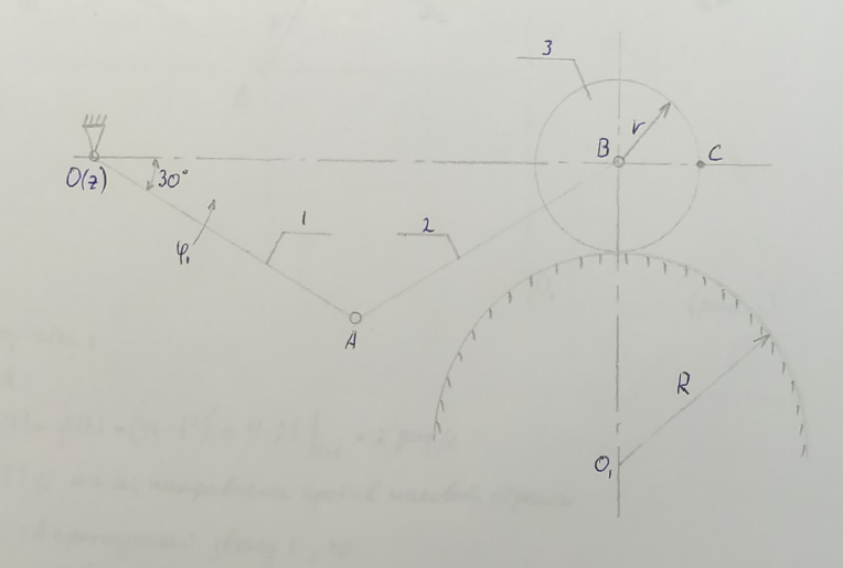 "Для данного положения механизма определить скорости и ускорения точек А, В, угловые скорости и ускорения звеньев 1, 2, 3, если f1 = 4t-t^2 рад, АВ=ОА=0,3 м, R=0,2 м, r=0,1 м".