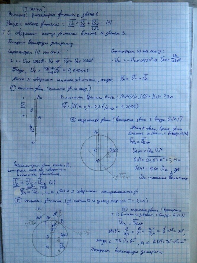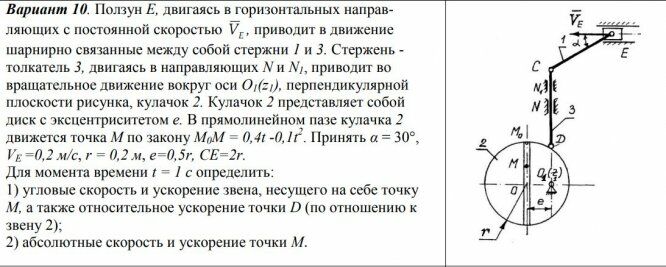 Вариант 10. Ползун E, двигаясь в горизонтальных направляющих с постоянной скоростью VE , приводит в движение шарнирно связанные между собой стержни 1 и 3. Стержень - толкатель 3, двигаясь в направляющих N и N1, приводит во вращательное движение вокруг оси O1(z1), перпендикулярной плоскости рисунка, кулачок 2. Кулачок 2 представляет собой диск с эксцентриситетом е. В прямолинейном пазе кулачка 2 движется точка М по закону M0M = 0,4t -0,1t 2 . Принять α = 30°, VE =0,2 м/с, r = 0,2 м, е=0,5r, СЕ=2r. Для момента времени t = 1 c определить: 1) угловые скорость и ускорение звена, несущего на себе точку М, а также относительное ускорение точки D (по отношению к звену 2); 2) абсолютные скорость и ускорение точки M.