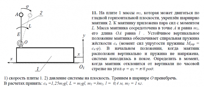 11. На плите 1 массы m1, которая может двигаться по гладкой горизонтальной плоскости, укреплён шарнирно маятник 2. К маятнику приложена пара сил с моментом L. Масса маятника сосредоточена в точке A и равна m2, его длина OA равна l . Устойчивое вертикальное положение маятника обеспечивает пружина жёсткости c (силу упругости пружины считать линейной), OE =l1. В начальном положении, когда маятник расположен вертикально и пружина не напряжена, система находилась в покое. Считая, что при деформации пружина остается прямолинейной и горизонтальной (деформация пружины Δ = l1·sinφ ≈ l1·φ), определить в момент, когда маятник отклонится от вертикали по часовой стрелке на угол φ = φ1 = π/6 рад: 1) скорость плиты 1.
