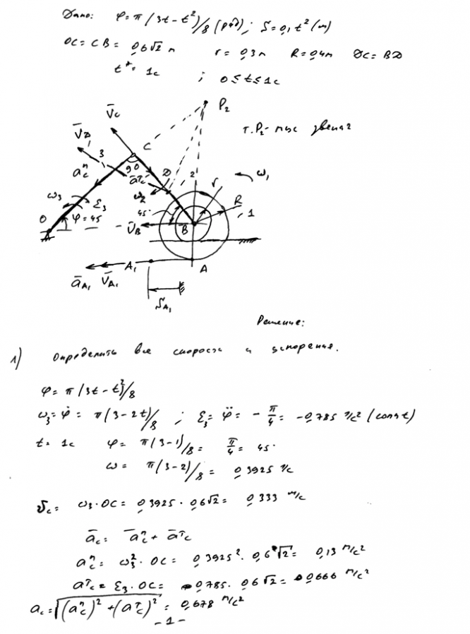 В механизме кривошип 3 вращается вокруг оси O(z) по закону (3 )/8 2 t t рад и шарниром С связан со звеном 2. Звено 2 шарниром В соединено с центром двухступенчатого катка 1, который катится с проскальзыванием по горизонтальной направляющей. На большую ступень катка намотан трос, конец которого A1 движется горизонтально по закону 2 0,1 1 S t A м. Принять OC CB 0,6 2 м, r 0,3 м, R 0,4 м, , 1 DC BD t с, 0 t 1 с