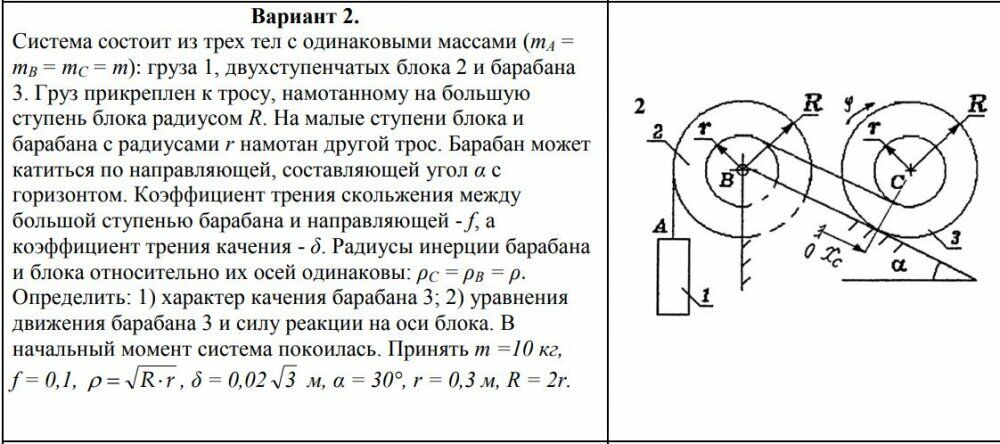 Вариант 2. Система состоит из трех тел с одинаковыми массами (mA = mB = mC = m): груза 1, двухступенчатых блока 2 и барабана 3. Груз прикреплен к тросу, намотанному на большую ступень блока радиусом R. На малые ступени блока и барабана с радиусами r намотан другой трос. Барабан может катиться по направляющей, составляющей угол α с горизонтом. Коэффициент трения скольжения между большой ступенью барабана и направляющей - f, а коэффициент трения качения - δ. Радиусы инерции барабана и блока относительно их осей одинаковы: ρC = ρB = ρ. Определить: 1) характер качения барабана 3; 2) уравнения движения барабана 3 и силу реакции на оси блока. В начальный момент система покоилась. Принять m =10 кг, f = 0,1, Rr , δ = 0,02 3 м, α = 30°, r = 0,3 м, R = 2r