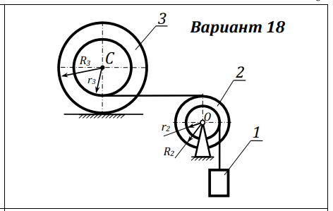 Задание для факультета ИБМ. Общее условие задачи. Исследуется движение механической системы из трех твёрдых тел: груза 1, блока 2 и катка 3, соединённых невесомыми нерастяжимыми нитями. Катки и блоки представляют собой либо однородные цилиндры, либо двухступенчатые цилиндры. В последнем случае кроме радиусов r и R ступеней задан радиус инерции тела ρ относительно оси, проходящей через центр масс. Трением на оси блока и скольжением нитей по блоку и катку пренебречь. Каток катится без проскальзывания по шероховатой поверхности, испытывая при этом действие трения качения. Система приходит в движение из состояния покоя. При этом груз 1 совершает поступательное прямолинейное движение, блок 2 – вращательное движение, а каток 3 - плоскопараллельное движение.