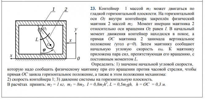 23. Контейнер 1 массой m1 может двигаться по гладкой горизонтальной плоскости. На горизонтальной оси Oz внутри контейнера закреплён физический маятник 2 массой m2. Момент инерции маятника 2 относительно оси вращения Oz равен I. В начальный момент движения контейнер находился в покое, а прямая OC маятника 2 занимала вертикальное положение (угол φ=0). Затем маятнику сообщают начальную угловую скорость ω0. К маятнику приложена пара сил, препятствующая его вращению, с постоянным моментом L. Определить: 1) значение начальной угловой скорости, которую надо сообщить физическому маятнику при его вращении против часовой стрелки, чтобы прямая OC заняла горизонтальное положение, а также в этом положении механизма: 2) скорость контейнера 1; 3) давление системы на горизонтальную плоскость.